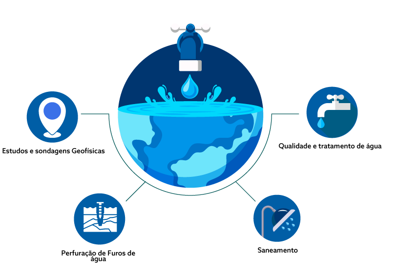 A empresa actua em quatro áreas essenciais para garantir o acesso à água potável e condições dignas de saneamento. Realiza estudos geofísicos para localizar fontes subterrâneas, faz a perfuração de furos de água com equipamentos modernos, assegura a qualidade e tratamento da água para torná-la segura para consumo e desenvolve infraestruturas de saneamento, como latrinas e sistemas de drenagem, promovendo ainda educação sanitária nas comunidades.